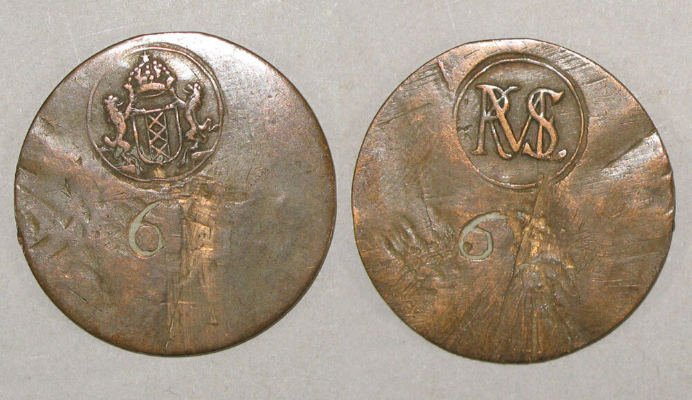voorzijde: stempel in cirkelvorm, waarin afgebeeld het gekroonde wapen van Amsterdam, geflankeerd door twee leeuwen, boven het gegraveerde nummer 6. keerzijde: stempel in cirkelvorm met het monogram MKRLS. Daaronder een gegraveerd nummer.- Trefwoorden