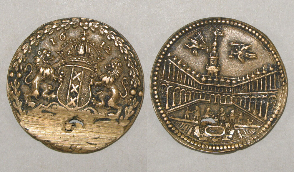 voorzijde: gekroond wapenschild van Amsterdam, geflankeerd door twee leeuwen onder het jaartal 1612; onder de afsnede een nummer. De rand is voorzien van een palmkrans.