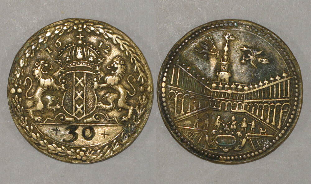 voorzijde: gekroond wapenschild van Amsterdam, geflankeerd door twee leeuwen onder het jaartal 1612; onder de afsnede een nummer. De rand is voorzien van een palmkrans.