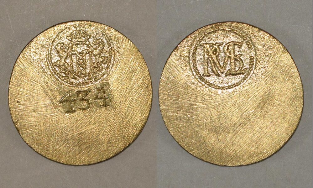 voorzijde: stempel in cirkelvorm, waarin afgebeeld het gekroonde wapen van Amsterdam, geflankeerd door twee leeuwen, boven het gegraveerde nummer 434. keerzijde: stempel in cirkelvorm met het monogram MKRLS.- Trefwoorden