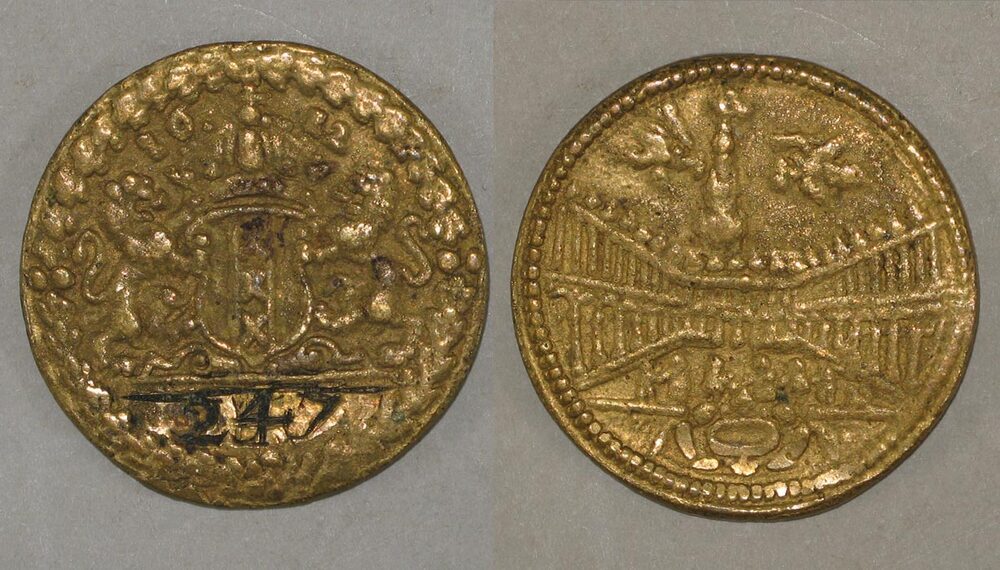 keerzijde: gezicht op het beursgebouw, waarboven twee Mercuriussen vliegen met staf en buidel in handen. De rand is voorzien van een parelkrans.