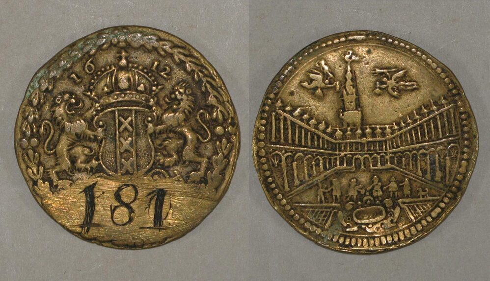 voorzijde: gekroond wapenschild van Amsterdam, geflankeerd door twee leeuwen onder het jaartal 1612; onder de afsnede een nummer. De rand is voorzien van een palmkrans.