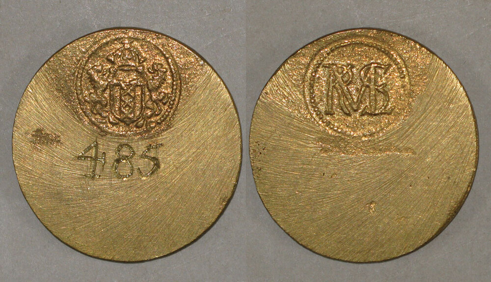 voorzijde: stempel in cirkelvorm met parelcirkel, waarin afgebeeld het gekroonde wapen van Amsterdam, geflankeerd door twee leeuwen, boven het gegraveerde nummer 485. keerzijde: cirkelvormig stempel met monogram MKRLS in parelcirkel.- Trefwoorden