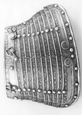 In de jaren zeventig van de zestiende eeuw bestelde de Amsterdamse schutterij vele harnassen in Noord-Italië. Dit exemplaar is waarschijnlijk vervaardigd in Brescia. Het is een zogenaamd pronkharnas, bestaande uit tien verschillende onderdelen om alle delen van het lichaam te beschermen. De harnassen werden gedragen door de infanterie van de schutterij: militairen te voet. Zij moesten de stadsmuren en –poorten beschermen en orde handhaven in Amsterdam. Tijdens de jaarlijkse kermis in september toonden de schutters zich in volle, glanzende wapenrusting aan de stad. Naarmate de kracht van vuurwapens sterker werd, werd het harnas geleidelijk aan meer een statussymbool dan bescherming. ( Sarah Remmerts de Vries)