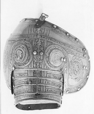 In de jaren zeventig van de zestiende eeuw bestelde de Amsterdamse schutterij vele harnassen in Noord-Italië. Dit exemplaar is waarschijnlijk vervaardigd in Brescia. Het is een zogenaamd pronkharnas, bestaande uit tien verschillende onderdelen om alle delen van het lichaam te beschermen. De harnassen werden gedragen door de infanterie van de schutterij: militairen te voet. Zij moesten de stadsmuren en –poorten beschermen en orde handhaven in Amsterdam. Tijdens de jaarlijkse kermis in september toonden de schutters zich in volle, glanzende wapenrusting aan de stad. Naarmate de kracht van vuurwapens sterker werd, werd het harnas geleidelijk aan meer een statussymbool dan bescherming. ( Sarah Remmerts de Vries)