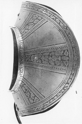 Gedecoreerd met biezen en 'mops and brooms'. Het borststuk met zwikvulling rankenputto; onder de hals een olifant. Het rugstuk met zwikvulling rankenputto.