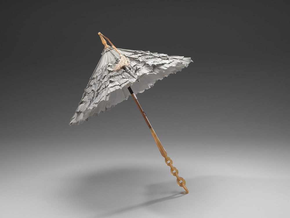 De parasol past in de mode rond 1870-1880, met veel ruches, randen en schulpen. Modieuze parasol.
