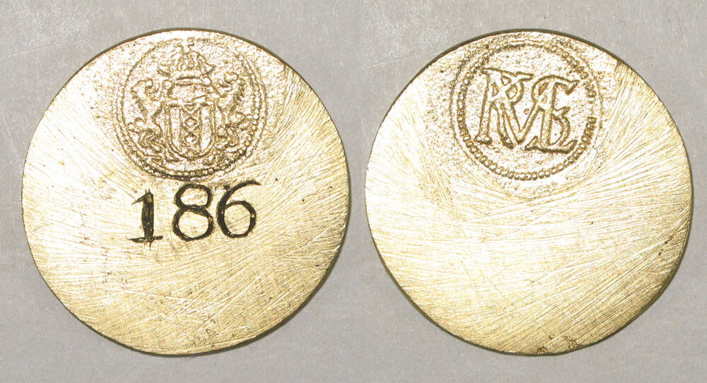 voorzijde: stempel in cirkelvorm met parelcirkel, waarin afgebeeld het gekroonde wapen van Amsterdam, geflankeerd door twee leeuwen, boven het gegraveerde nummer 186. keerzijde: cirkelvormig stempel met monogram MKRLS in parelcirkel.- Trefwoorden