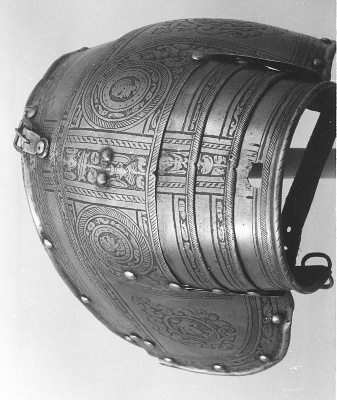 In de jaren zeventig van de zestiende eeuw bestelde de Amsterdamse schutterij vele harnassen in Noord-Italië. Dit exemplaar is waarschijnlijk vervaardigd in Brescia. Het is een zogenaamd pronkharnas, bestaande uit tien verschillende onderdelen om alle delen van het lichaam te beschermen. De harnassen werden gedragen door de infanterie van de schutterij: militairen te voet. Zij moesten de stadsmuren en –poorten beschermen en orde handhaven in Amsterdam. Tijdens de jaarlijkse kermis in september toonden de schutters zich in volle, glanzende wapenrusting aan de stad. Naarmate de kracht van vuurwapens sterker werd, werd het harnas geleidelijk aan meer een statussymbool dan bescherming. ( Sarah Remmerts de Vries)