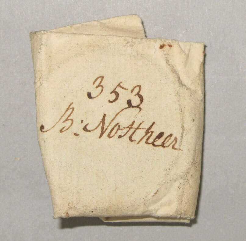 Papieren wikkel, waarop in zwart nummer 353 is genoteerd en daaronder de naam B. Nostheer.- Trefwoorden