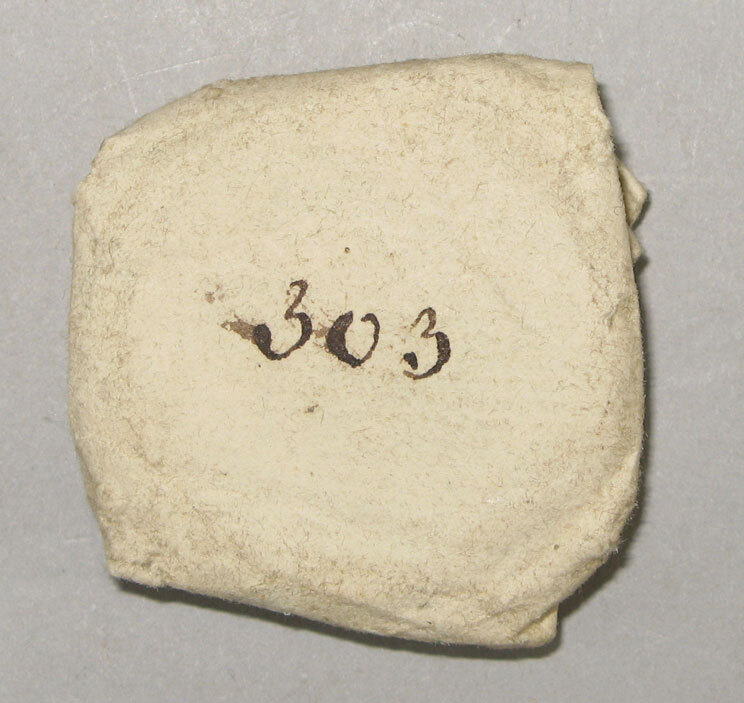 Papieren wikkel waarop in zwarte inkt nummer 303 is genoteerd.- Trefwoorden