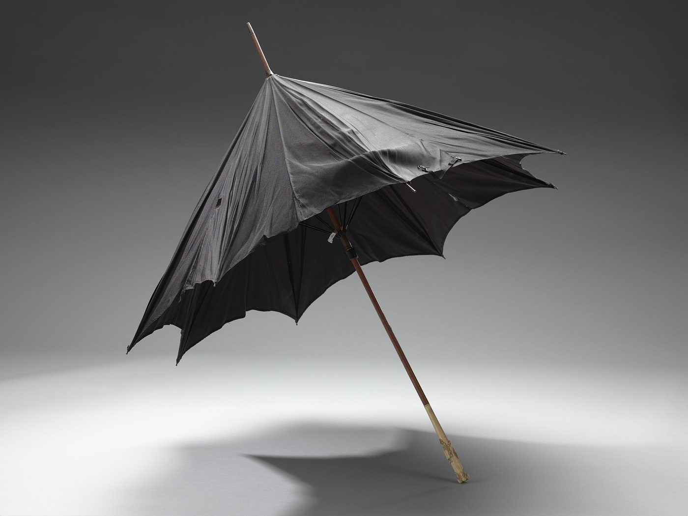 Paraplu met houten steel, met ivoren handvat, met snijwerk van een wapenschild en korenaren, knop met accantusbladeren. Het dek is van zwarte zijde. Geen voering, met in de top een gevoerd rondje van zwart en zilver. De steel loopt door het dek heen, uitlopend in metalen punt, en metalen ring die het frame op zijn plaats houdt. Spaken van metaal en uitlopend in metalen knoppen. Onderaan het dek een zwarte band met metalen ring en metalen knoop, waarmee de paraplu werd gesloten.