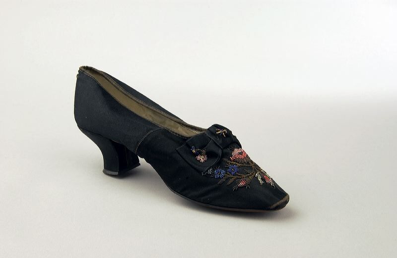 Enkele schoen van zwarte satijn met kralen borduursel (gouddraad en goudspiraal), strikje, links en rechts, met hak. Geen links en rechts. Zeemleren voering, linnen bij de neus.