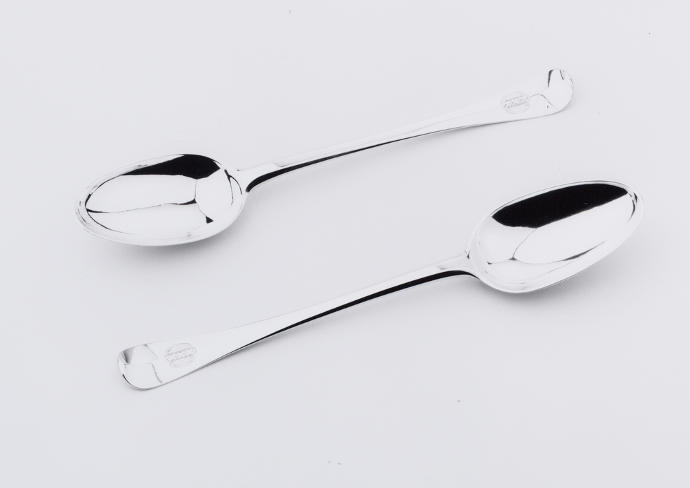Potagielepels als deze werden onder meer gebruikt voor het opscheppen van ragouts en stoofgerechten. Het is twijfelachtig of deze exemplaren hebben toebehoord aan het Spinhuis, een strafinrichting voor vrouwen. Het gegraveerde embleem met het spinnewiel wijkt af van het spinnende vrouwtje, zoals dit voorkomt op zilver dat wel met zekerheid met het Spinhuis in verband kan worden gebracht (cat.nr. LA 792, KA 14056-14057). Zie voor soortgelijke potagielepels van het Burgerweeshuis: cat.nr. KB 2346.1/2. ( Bert Vreeken)