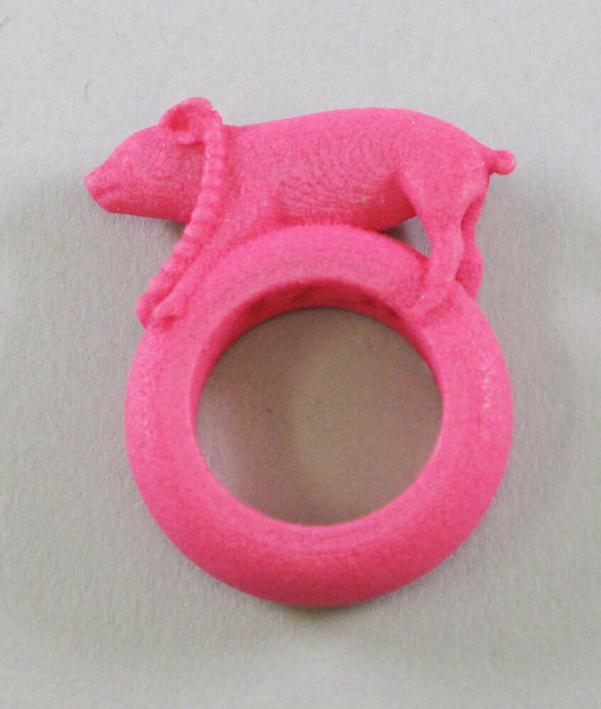 Roze ring van kunststof. Op ring is een varken afgebeeld met een ketting om. Aan binnenzijde ring staan getallen 17.8 als inscriptie.- Trefwoorden