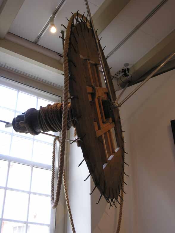 Dit hijsrad is afkomstig uit een voormalig pakhuis aan de Spuistraat. Door de omvang van het reusachtige rad was het takelen van zware vracht makkelijk door één man te doen. Een lang touw 'zonder einde' maakte het mogelijk vanuit elke verdieping het rad in beweging te brengen. Hierdoor werd het eigenlijke hijstouw om de as gewikkeld of juist afgewikkeld. Van de as liep het touw omhoog door de hijsbalk heen, om aan de bovenkant van de hijsbalk naar buiten te komen. Een met lood bekleedde houten bedekking van de hijsbalk voorkwam dat het touw ging rotten. Door een tweede opening ging het touw vervolgens omlaag. Katrollen zorgde ervoor dat het touw soepel door en over de hijsbalk liep.