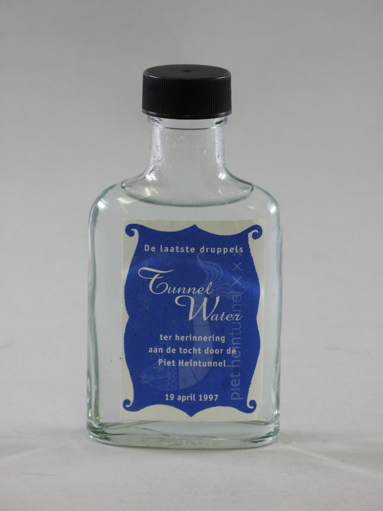 Het verantwoordelijke projectbureau voor de Piet Heintunnel organiseerde op 19 april 1997 een open dag om, aan de vooravond van de ingebruikname, vol trots de 'langste autotunnel van Nederland' aan het publiek te presenteren. Duizenden mensen kwamen erop af: fietsers konden via de ene buis gaan, wandelaars door de andere. En als slagroom op de cake kregen de bezoekers dit flesje 'tunnelwater', met daarin de laatste druppels die uit de Piet Heintunnel zouden zijn gepompt. ( Maarten Jansen)
