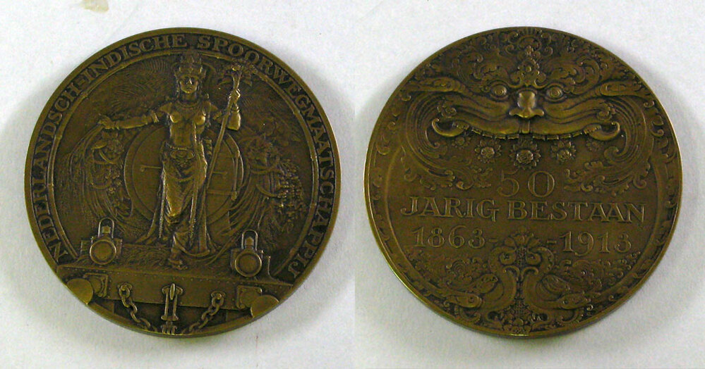 voorzijde: in een omschrift een locomotief van voren gezien met voorop de gekroonde Oogstgodin, een staf in haar linkerhand en oogst gewas in haar rechterhand, te midden van loof en vruchten.