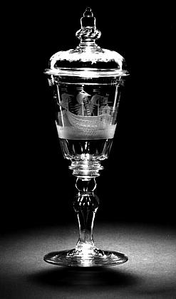 Helder kleurloos glas. Platte voet. Balusterstam met gefacetteerde knoop en langgerekte luchtbel, een knoop en twee schijven. Conische kelk met gefacetteerde basis. Op kelk een zeilende driemaster, twee gebouwen en het opschrift: HET=WEL=VAAREN=VAN= DEESEN=BOODEN/.