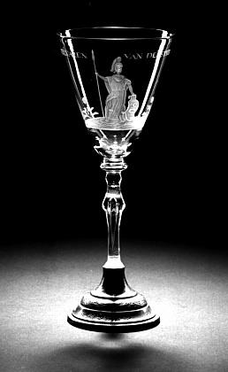 Helder kleurloos glas. Gewelfde zilveren voet met gegraveerde bloemtakjes. Balusterstam met langgerekte luchtbel en knoop. Conische kelk met afgeronde basis. Op kelk Minerva met lans en schild, een uil en het randschrift: T WELVAREN VAN DE STUDIE/.