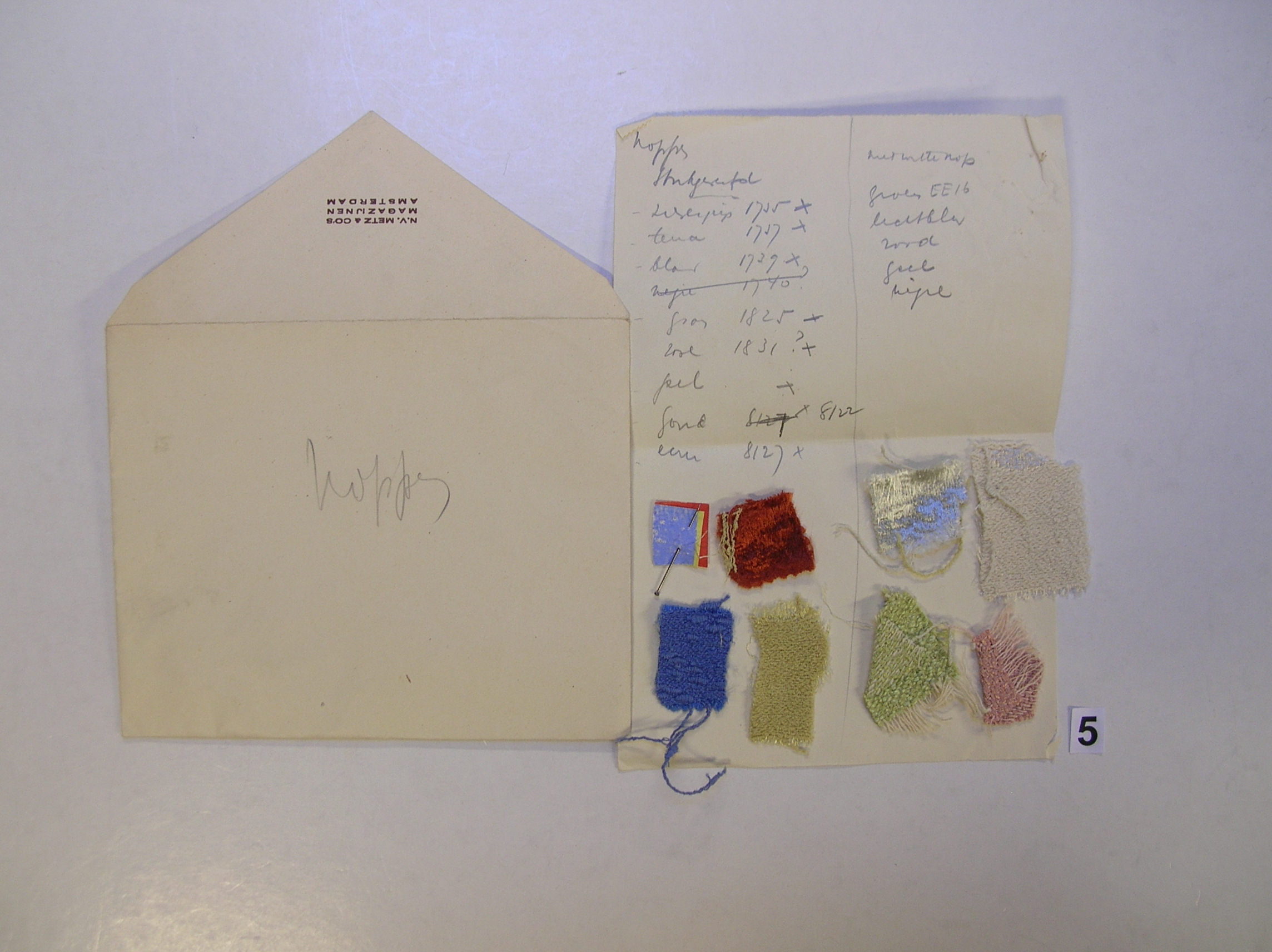 Envelop met opschrift 'koppes', waarin een lijst met notities en diverse stalen zitten, de stalen hebben de Van der Leck kleuren.- Trefwoorden