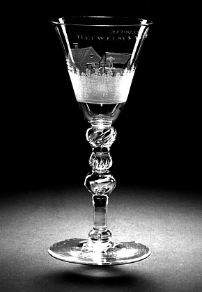 Helder kleurloos glas. Platte voet. Basisknoop. Balusterstam met luchtbel en twee knopen met gedraaide luchtbellen. Conische, licht uitbuigende kelk met afgeronde basis. Rondom kelk een hopkwekerij waarboven het randschrift: HET WELSYN, VAN DE HOP, NEGOOTIE/.