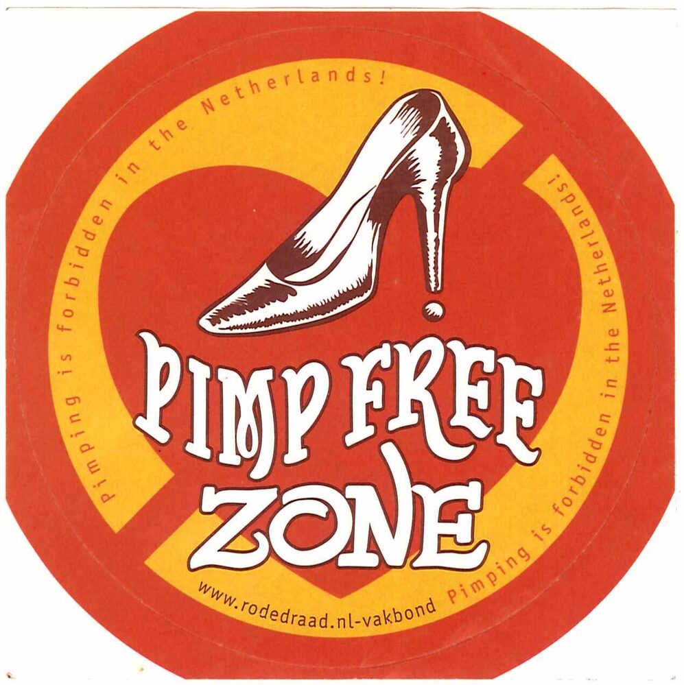 Ronde sticker in vorm van verbodsbord. In het midden een gestileerd hart met daarop een damesschoen. Onder damesschoen tekst: PIMP FREE/ ZONE/. Rondschrift: Pimping is forbidden in the Netherlands!- Trefwoorden