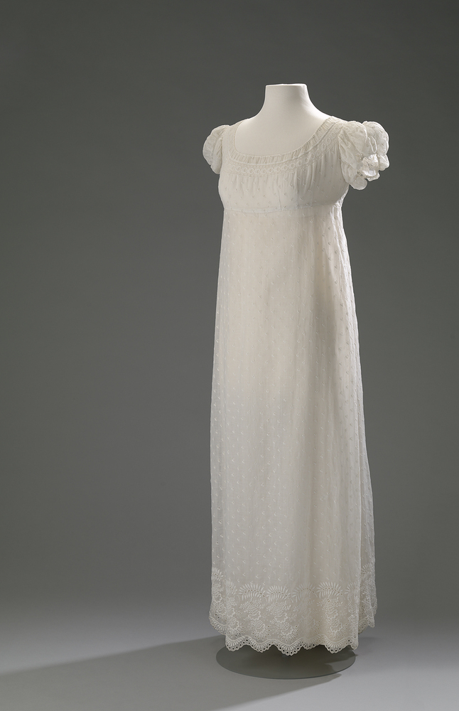Empire japon van katoenen batist (mousseline) met een strooimotief van gestileerde bloemknoppen met blaadjes. Het motief is met de hand erop geborduurd en heeft opengewerkte delen. De ronde hals en korte pofmouwen zijn versierd met tussenzetsels van kloskant. Hoge taille. Geschulpte zoom versierd met een bladmotief.