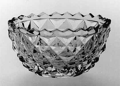 Helder kleurloos glas. Vlakke bodem, de onderzijde in stervorm geslepen. Bolvormig lichaam, in diamanten geslepen. Gekartelde rand.- Trefwoorden