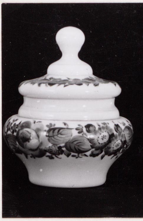 Melkglas. Vlakke bodem. Afgeplat bolvormig lichaam, de bovenzijde licht ingesnoerd. Gewelfd deksel met bolvormige knop. Rondom lichaam en deksel blad- en bloemmotieven. Resten verguldsel op lichaam en deksel.- Trefwoorden
