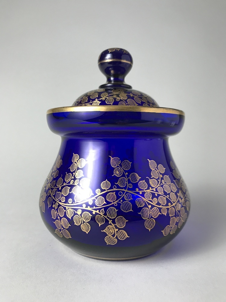 Helder kobaltblauw glas. Vlakke bodem. Bolvormig lichaam met opstaande verdikte rand. Gewelfd deksel met bolvormige knop. Op lichaam en deksel in verguldsel bladranken. Verguldsel op rand en deksel.