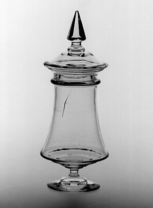Helder kleurloos glas. Licht conische voet. Korte stam met twee schijven. Concaaf-conisch lichaam met inspringende basis en verdikte bovenzijde. Gewelfd deksel met puntig gefacetteerde knop.