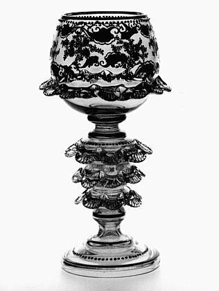 Helder kleurloos glas, geel en paars gelusterd glas. Gewelfde voet, aan één stuk geblazen met holle stam. Voet en stam van geel gelusterd glas. Stam met vier geledingen. Schijf. Bolvormige kelk van paars gelusterd glas. Rondom drie geledingen stam en kelk een glasdraad van helder kleurloos glas met geknepen ribbelpatroon. Rondom kelk in reliëfverguldsel twee banden met bloemtakjes en rocaille motieven. Vergulde banden en parelranden op voet, geledingen, kelk en mondrand.