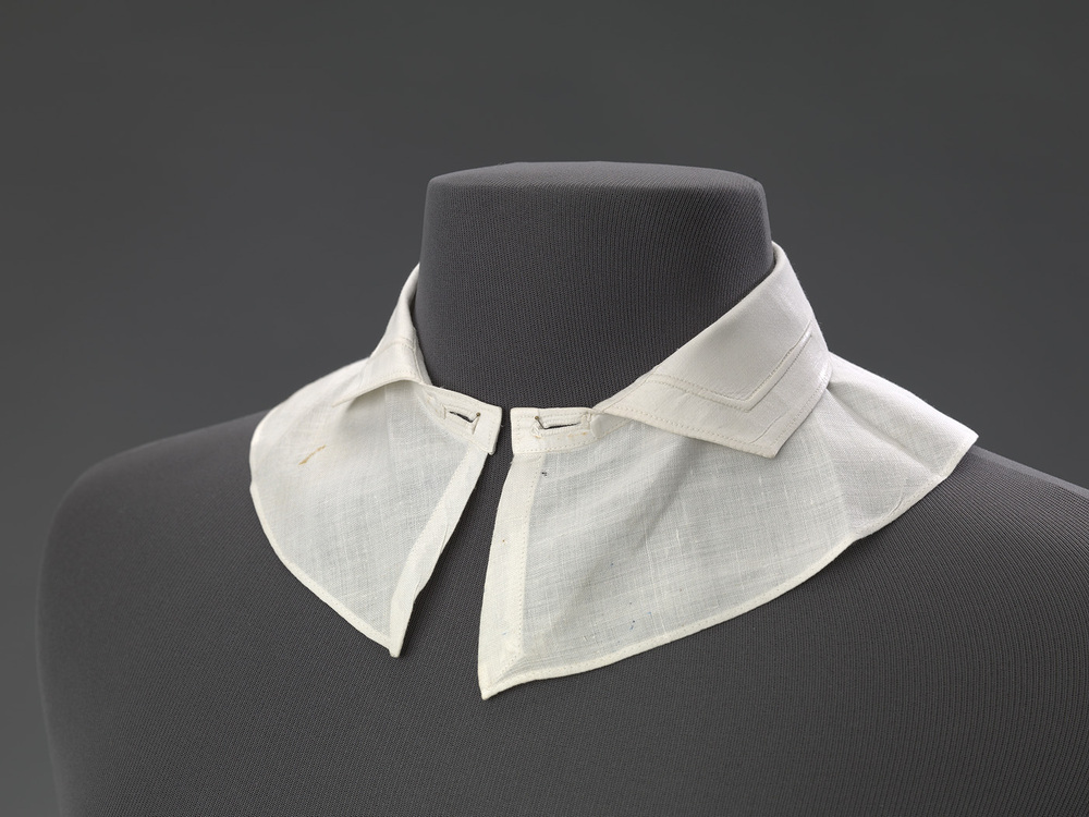 Witte gesteven kraag met boord, sluiting met boordknoopje (knoop ontbreekt). Mogelijk gedragen door huispersoneel.- Trefwoorden