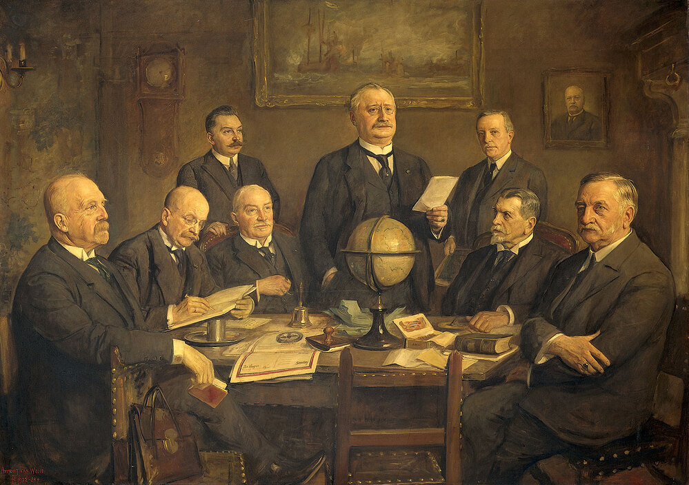 Zittend en staand rond een tafel zijn de bestuursleden te zien van de Nederlandsche Overzee Trust Maatschappij (NOT). Dit waren kooplieden, bankiers en reders onder leiding van Dr. C.J.K. van Aalst (staande in het midden, met papier in hand). De handelsmaatschappij was op 24 november 1914 opgericht als naamloze vennootschap, om de Nederlandse handel te waarborgen tijdens de Eerste Wereldoorlog. Tegenover oorlogvoerende mogelijkheden had de Maatschappij de taak om te garanderen dat handelsgoederen uitsluitend voor binnenlands gebruik in het neutrale Nederland waren bestemd. De NOT werd na het einde van de oorlog in 1919 opgeheven. Dit groepsportret is enkele jaren later vervaardigd. ( Sarah Remmerts de Vries)
