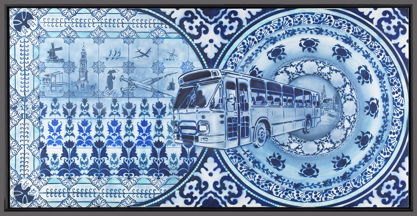 Kunstenaar Hugo Kaagman is sinds de jaren zeventig een pionier op het gebied van Street Art. In zijn graffiti- en stencilkunst maakt hij veelvuldig gebruik van Delfts Blauw (door Kaagman zelf ‘Shocking Blue’ genoemd), vermengd met oosterse decoratiepatronen. Thema’s variëren van burgerlijk-Hollandse motieven tot ironisch kritiek op de hedendaagse politiek en maatschappij. In dit werk besteedt hij aandacht aan de verslaafdenzorg in Amsterdam, met de methadonbus als symbool en stralend middelpunt. (Dakloze) heroïnegebruikers kunnen sinds 1979 via de bus methadon verstrekt krijgen van de GGD Amsterdam. ( Sarah Remmerts de Vries)