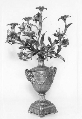 - De kandelaber heeft de vorm van een in neoclassicistische stijl uitgevoerde vaas, waarin een boeket lelies is geplaatst. In het boeket staan vijf lelietakken die zijn voorzien van kaarsenhouders in plaats van stampers. ( Bert Vreeken)