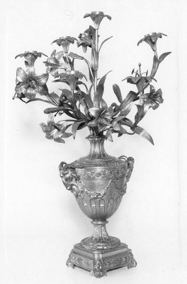 - De kandelaber heeft de vorm van een in neoclassicistische stijl uitgevoerde vaas, waarin een boeket lelies is geplaatst. In het boeket staan vijf lelietakken die zijn voorzien van kaarsenhouders in plaats van stampers. ( Bert Vreeken)