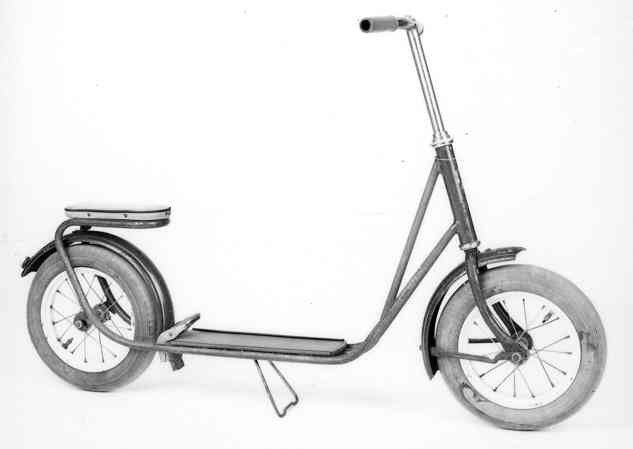 Blauw gelakt frame, chromen stuur met oranje handvatten, spaakwielen met rubber luchtbanden. Op achterwiel zitje en rem.- Trefwoorden