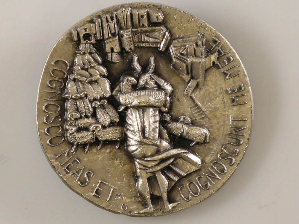 Zilveren penning. Op voorzijde portret van paus Paulus VI, randschrift PAULUS PONT MAX ANNO VIIII en op keerzijde bijbelse voorstelling en randschrift COGNOSCO MEAS ET COGNUSCUNT ME MEAE.- Trefwoorden