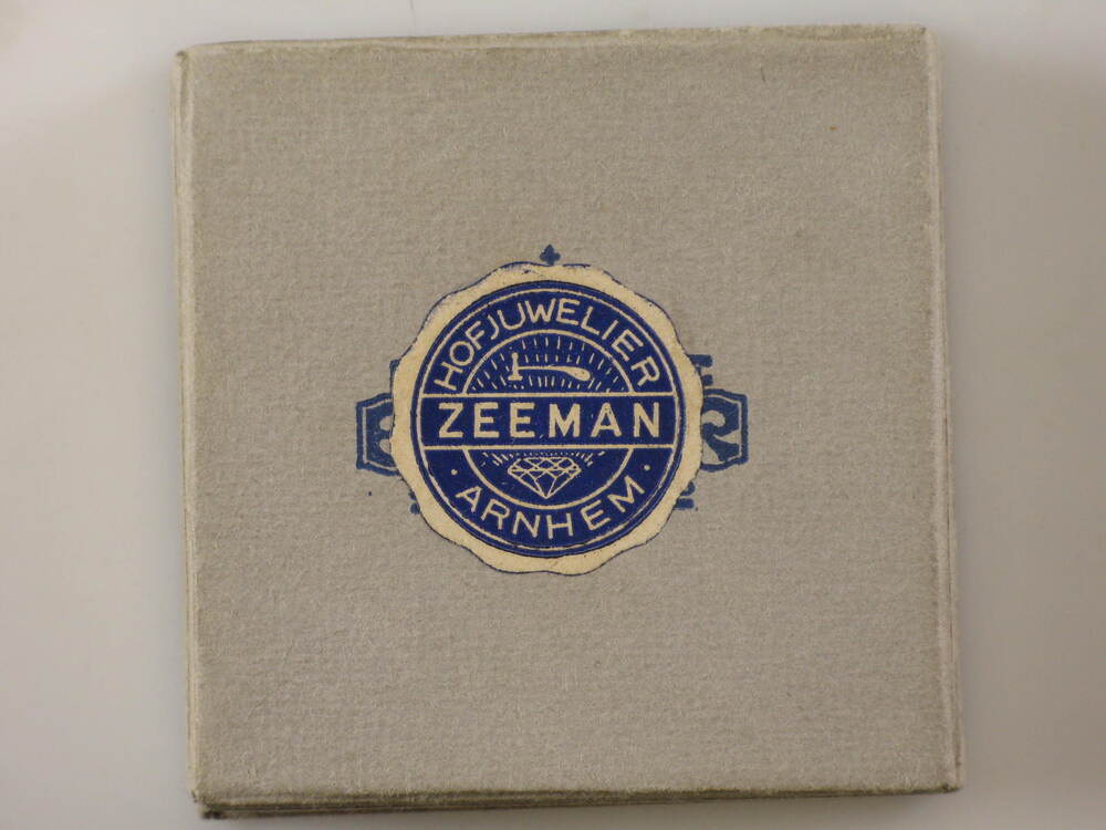 Kartonnen doosje met opdruk Koninklijke Begeer. Daarover sticker van hofleverancier Zeeman, Arnehem.- Trefwoorden