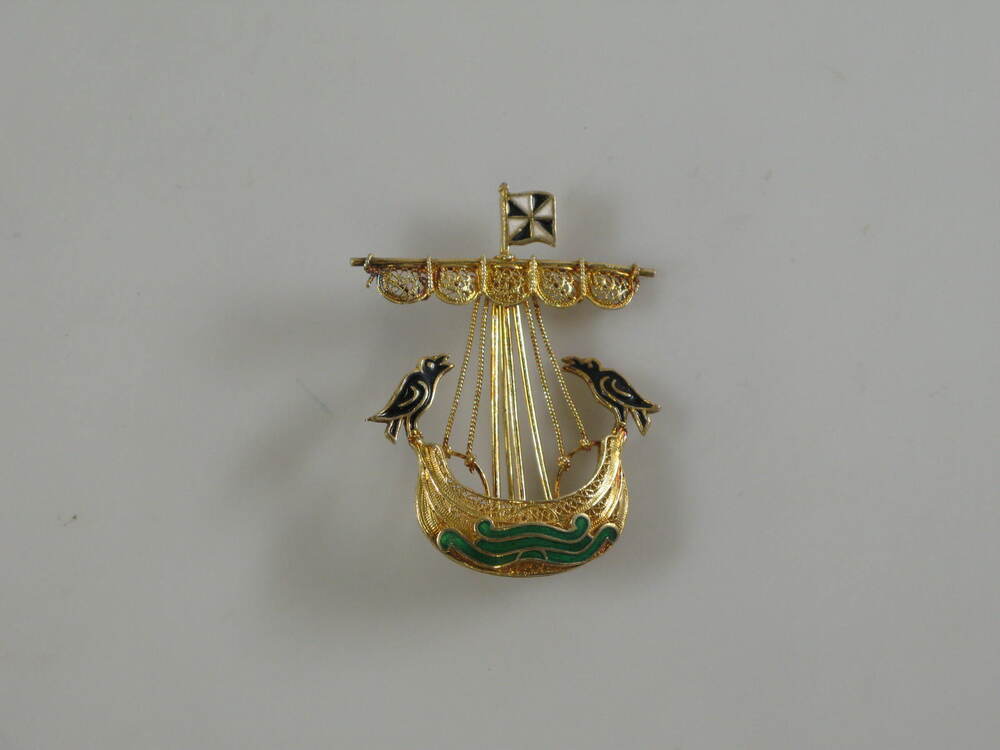 Goudkleurig, geëmailleerd speldje van zeilschip met op beide zijden een zwarte vogel.- Trefwoorden