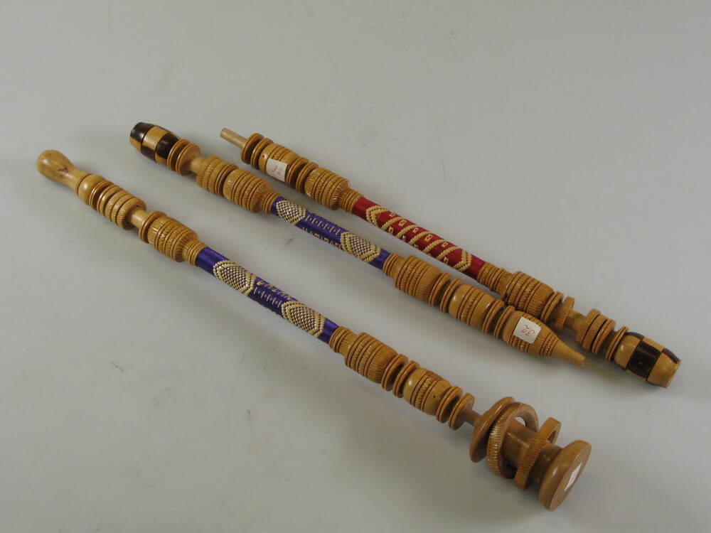Handgesneden houten stok met ringetjes, bekleed met paars textiel; op textiel geborduurde opschrift: RAGIP ÇATAK.- Trefwoorden