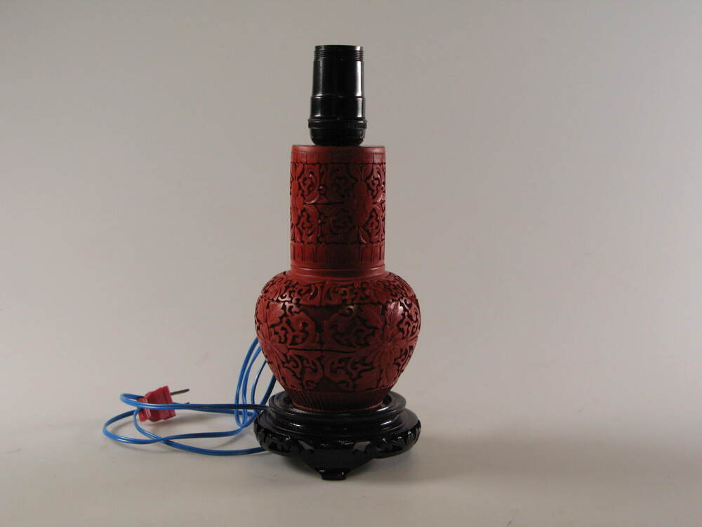 Elektrische lamp met rood geverfd houtsnijwerk met bloemotieven.- Trefwoorden
