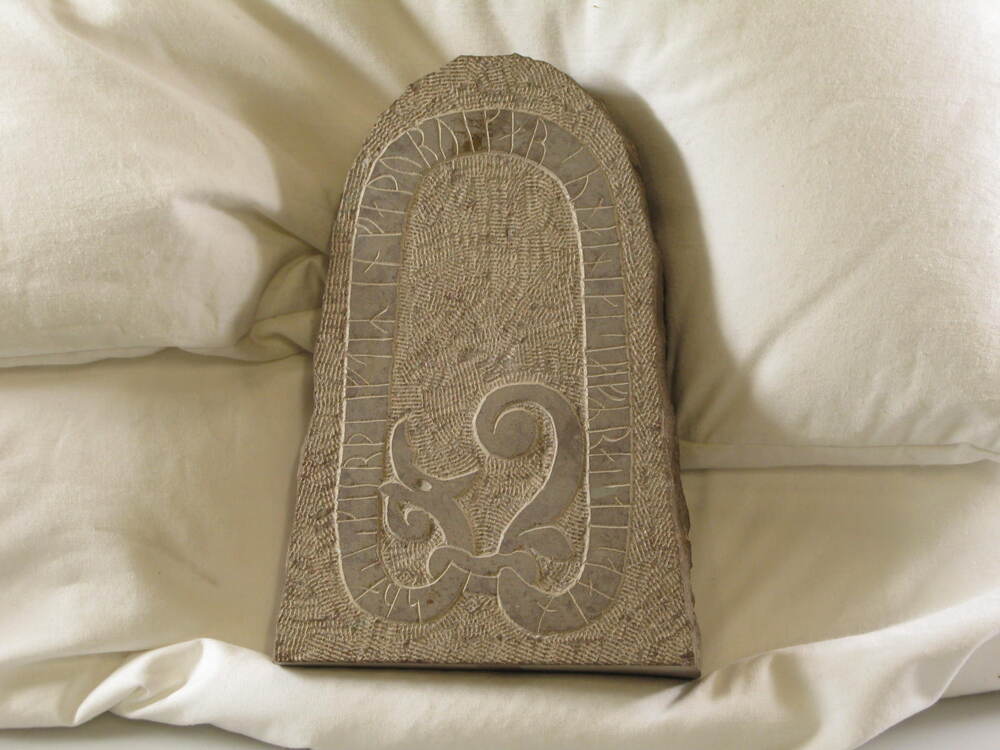 - opschrift: This is a true cpoy of a rune-stone, which was found on the Swedish island of Öland in the parish of Gärdslösa. The stone is from te ear- ly 11th century. It bears the following inscrip- tion: suain: kiarthi: eftir: sin: fathur: uikar: sun: ainiki: sialfr: raisti: stain