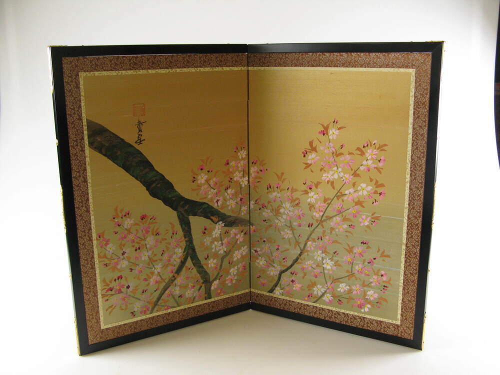 Kamerscherm met een schildering van bloesem op textiel (1), in kartonnen doos (2).- Trefwoorden