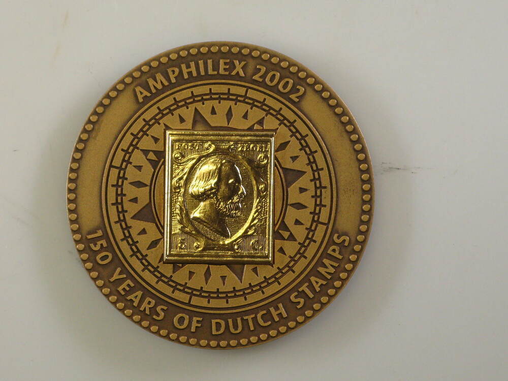 Bronzen penning met op voorzijde afbeelding van oude postzegel van 5 cent en randschrift: AMPHILEX 2002/ 150 YEARS OF DUTCH STAMPS. Op keerzijde de Amsterdamse andreaskruisen en VOC-vignet, randschrift: 400 YEARS VOC 1602-2002/ AMSTERDAM 30 AUGUST 3 SEPTEMBER 2002; in het midden is de naam van burgemeester Cohen gegraveerd: Mr. M.J. Cohen.