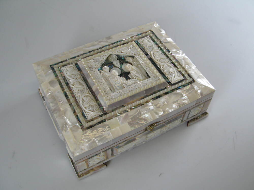 Kistje bedekt met parelmoer. Bovenop deksel is kersttafereel uitgesneden in parelmoer. Messing sluiting. Binnenzijde en onderzijde is bekleed met donkerrood fluweel.- Trefwoorden
