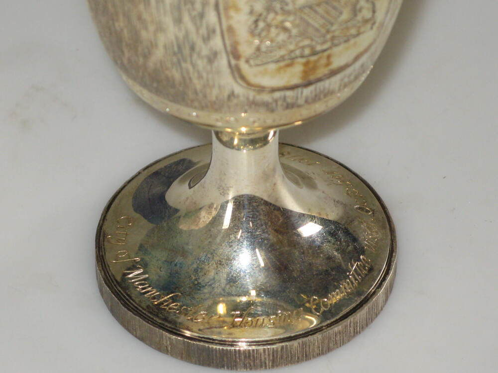 Zilveren beker met het stadswapen van Manchester. Op voet is tekst gegraveerd: City of Manchester Housing Committee visit October 1978.- Trefwoorden