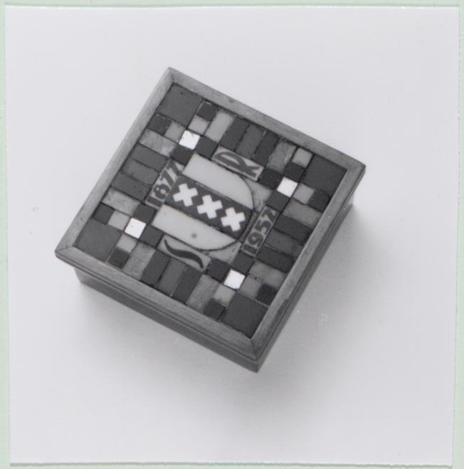 Vierkant doosje van blank gelakt triplex met los deksel. De bovenzijde van het deksel ingelegd met vierkante en rechthoekige glazen steentjes in blauw, rood, goud, grijs en zwart. In het midden het stadswapen van Amsterdam, geflankeerd door de letters: S en R